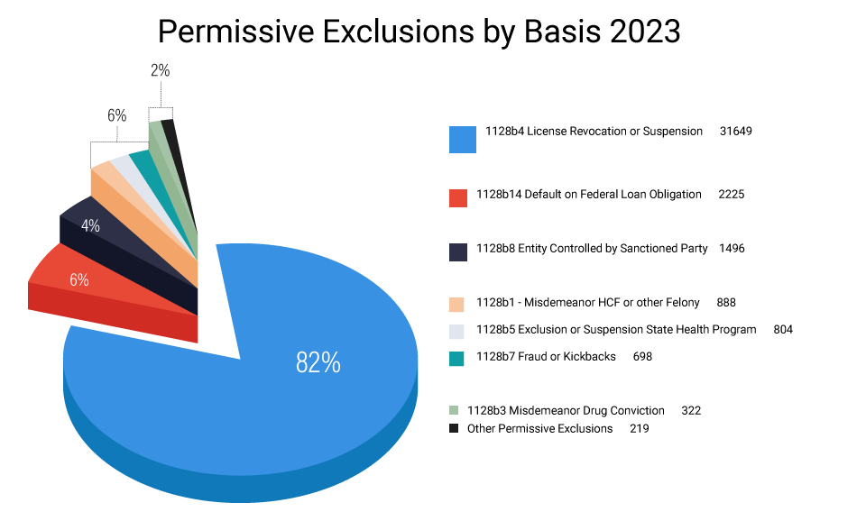 With the passage of the Medicare-Medicaid Anti-Fraud and Abuse Amendments[4] in 1977, mandatory OIG exclusion became mandated in cases where a physician and other practitioner has been convicted of program-related crimes. (now codified at section 1128 of the Social Security Act). Since that time, various additional bases for both mandatory[5] and permissive[6] exclusion have been enacted. Collectively assessed, the most frequent statutory basis relied on by the OIG when seeking to exclude an individual from participation in Federal and State health care programs is “42 USC §1320a-7(b)(4) License Revocation or Suspension.[7]” As this provision set out: