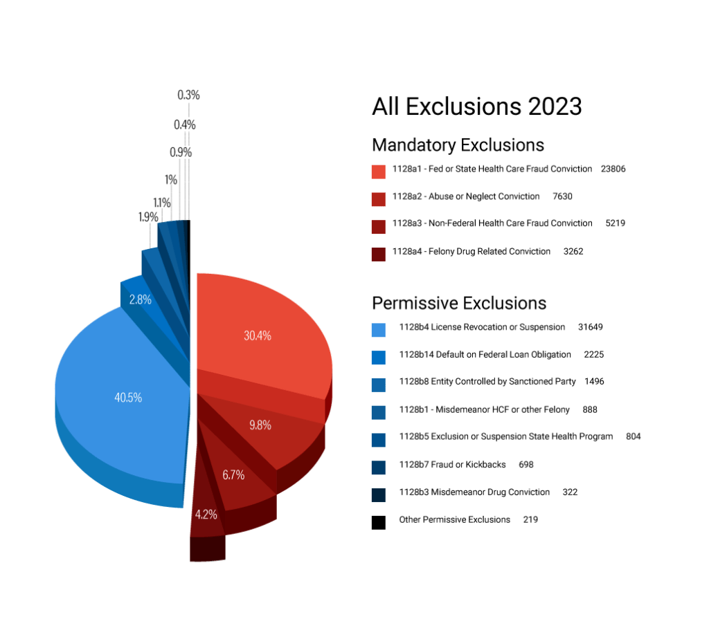 During this past reporting period the OIG reported that most of its exclusions came from license revocation, convictions for crimes relating to Medicare or Medicaid, financial misconduct, controlled substances, or patient abuse or neglect. This is consistent with past OIG Exclusions as you can see on this chart.