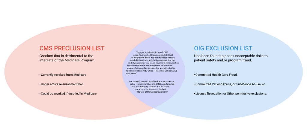 The OIG Exclusion List is NOT the same as this new CMS List. That being said, there is some overlap. If you have been excluded, you can still find yourself on the Preclusion List if you fall into the either of the two criteria listed above under the “How Does Someone End up on The CMS Preclusion List? ” section. As you can see in the diagram below, there is some overlap, but not much.